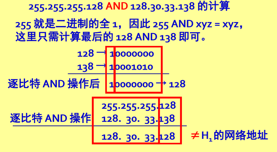 主机H1 首先将本子网的子网掩码255.255.255.128与分组的IP地址128.30.33.138 逐比特相“与”(AND 操作)