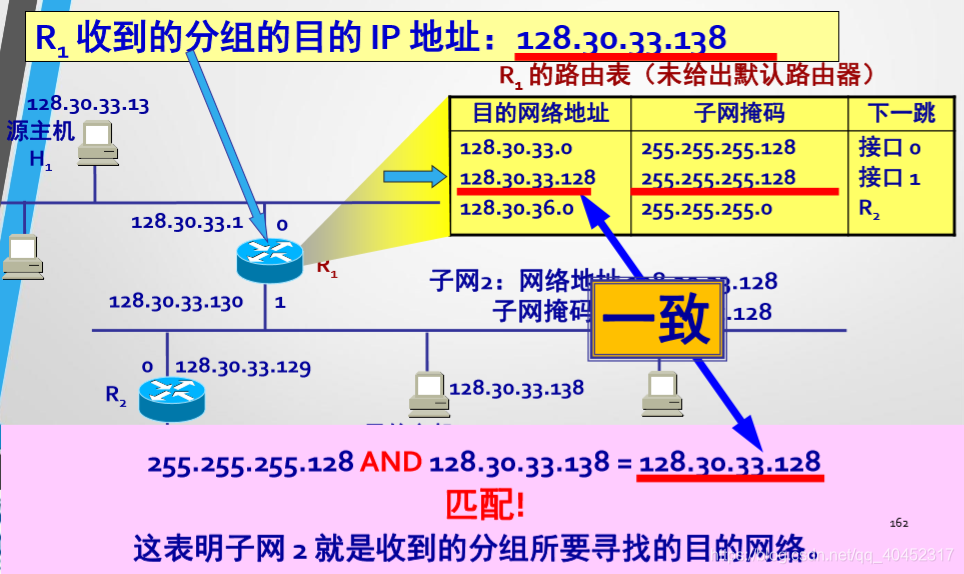 路由器R1收到分组后就用路由表中第1个项目的子网掩码和128.30.33.138 逐比特AND操作。