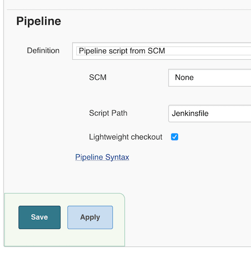 首先,按照方法1中解释的类似步骤,从经典UI中创建一个新流水线,并将该流水线命名为:SCM-Test-Pipeline。接下来,选择SCM- test -Pipeline并在Pipeline选项卡下,定义选择的Pipeline script from SCM选项,如下所示。确保脚本路径显示Jenkinsfile,如下所示。