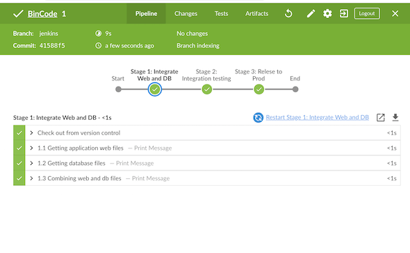 一旦管道被创建并执行,它将显示每个阶段的状态。单击特定的stage名,查看对应的stage输出,如下所示。