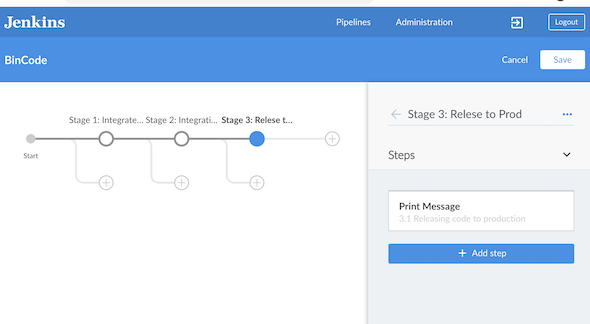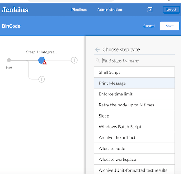 由于我们还没有创建Jenkinsfile,它将显示一个从用户界面创建新管道的提示。管道创建UI将引导您完成创建新管道的步骤。首先,单击start旁边的+。点击Add a Step,选择Print Message,如下图所示。