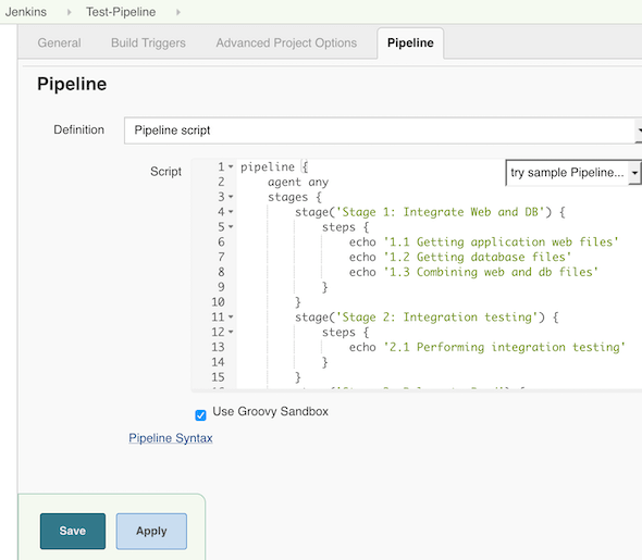 一旦创建了测试流水线,就编辑流水线。单击Pipeline选项卡,并粘贴以下代码。这个示例代码有三个简单的阶段,每个阶段中定义了步骤。对于这个简单的示例,steps部分只有echo命令,它将输出一条消息。