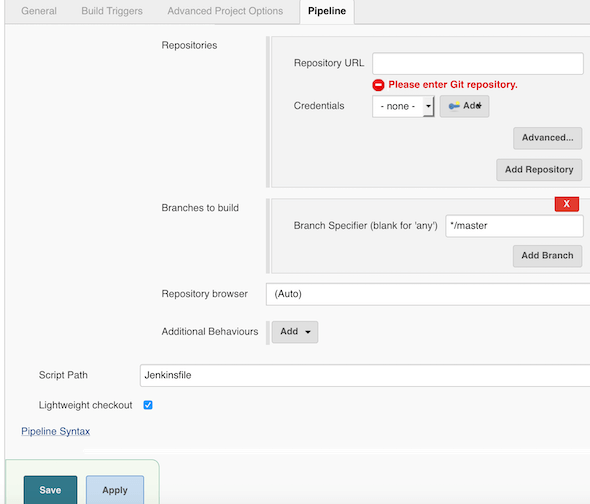 现在,这还将询问您的SCM仓库的详细信息。在这里输入您的git仓库详细信息。如果您的jenkins文件位于特定的分支中,请确保指定分支名称正确。
