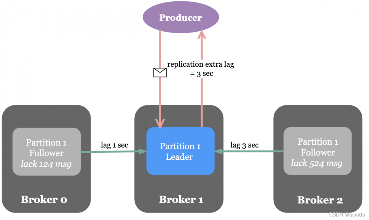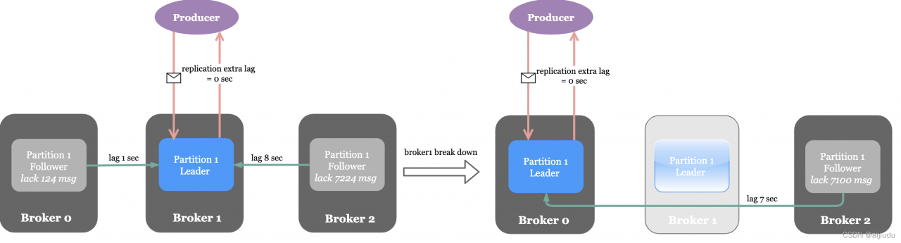 上图左侧的稳态场景下,Partition1的数据冗余备份在Broker0和Broker2上;Broker0中的副本与Leader副本因网络开销等因素存在1秒钟同步时间差,Broker0中的副本落后124条消息;Broker2中的副本存在8秒钟同步时间差,Broker2中的副本落后7224条消息。若图中的Broker1突然宕机且Broker0被选为Partition1的Leader,则在Leader宕机前写入的124条消息未同步至Broker0中的副本,这次宕机会造成少量消息丢失。