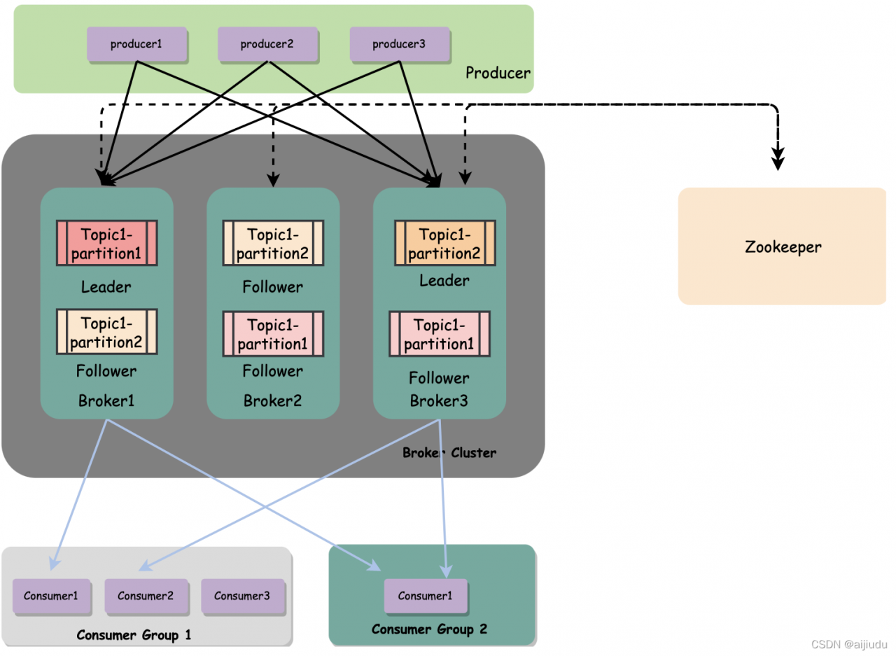 Producer生产消息,以Partition的维度,按照一定的路由策略,提交消息到Broker集群中各Partition的Leader节点,Consumer以Partition的维度,从Broker中的Leader节点拉取消息并消费消息。