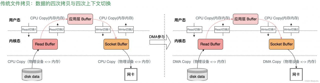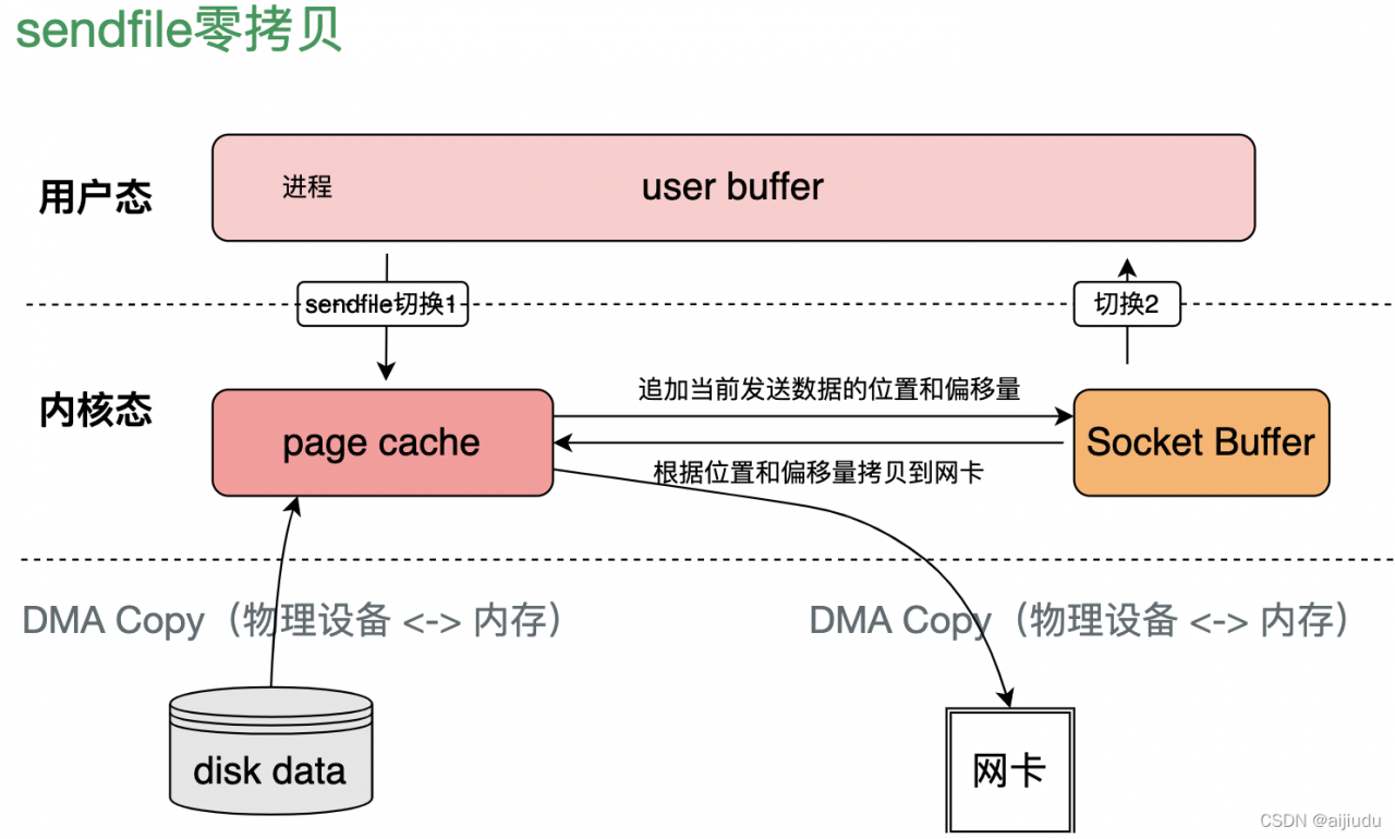 sendfile 依赖于 DMA 技术,将四次CPU全程负责的拷贝与四次上下文切换减少到两次,避免了内核空间到用户空间的CPU全程负责的数据移动;