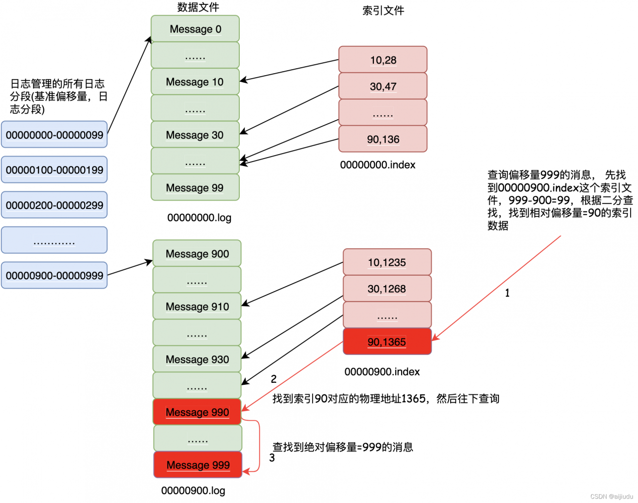 如上图所示:假设有1000条消息,每100条消息写满了一个日志分段,一共会有10个日志分段。客户端要查询偏移量为999的消息内容,如果没有索引文件,我们必须从第一个日志分段的数据文件中,从第一条消息一直往前读,直到找到偏移量为999的消息。有了索引文件后,我们可以在最后一个日志分段的索引文件中,首先使用绝对偏移量999减去基准偏移量900得到相对偏移量99,然后找到最接近相对偏移量99的索引数据90,相对偏移量90对应的物理地址是1365,然后再到数据文件中,从文件物理位置1365开始往后读消息,直到找到偏移量为999的消息。