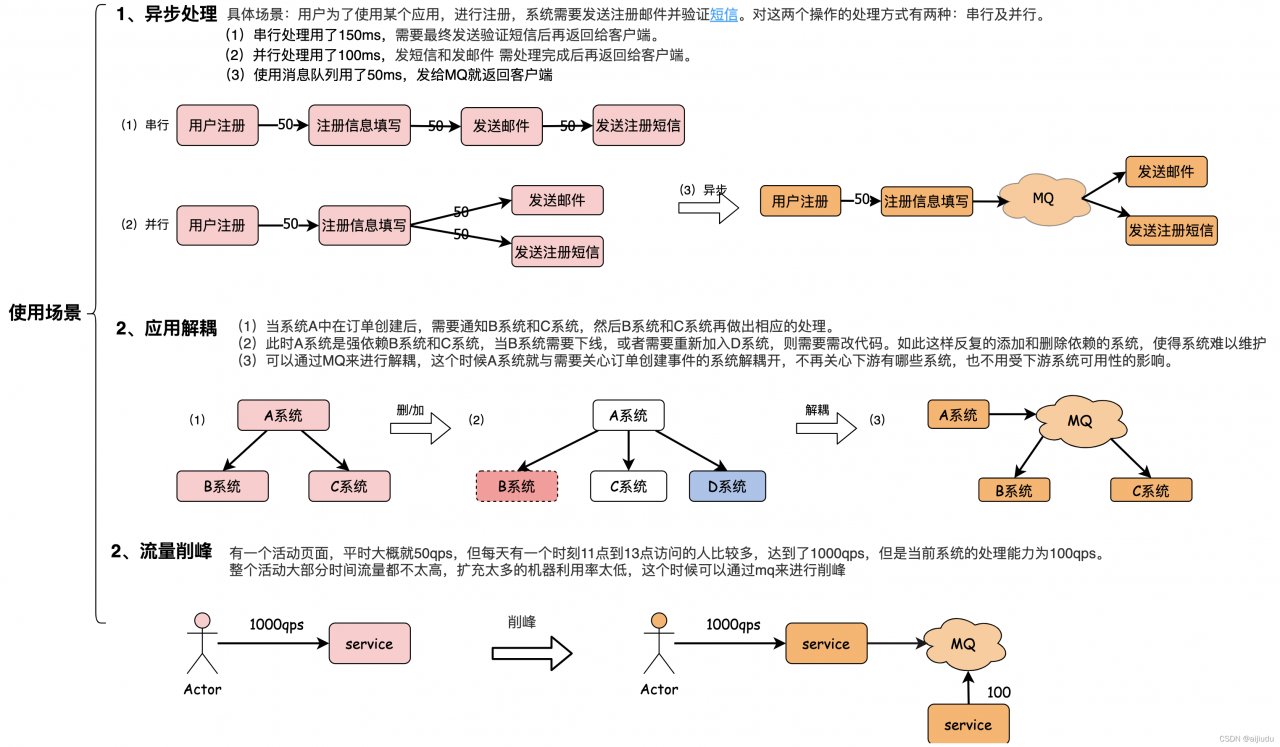 (2)消息系统:解耦、冗余存储、流量削峰、缓存数据、异步处理等。