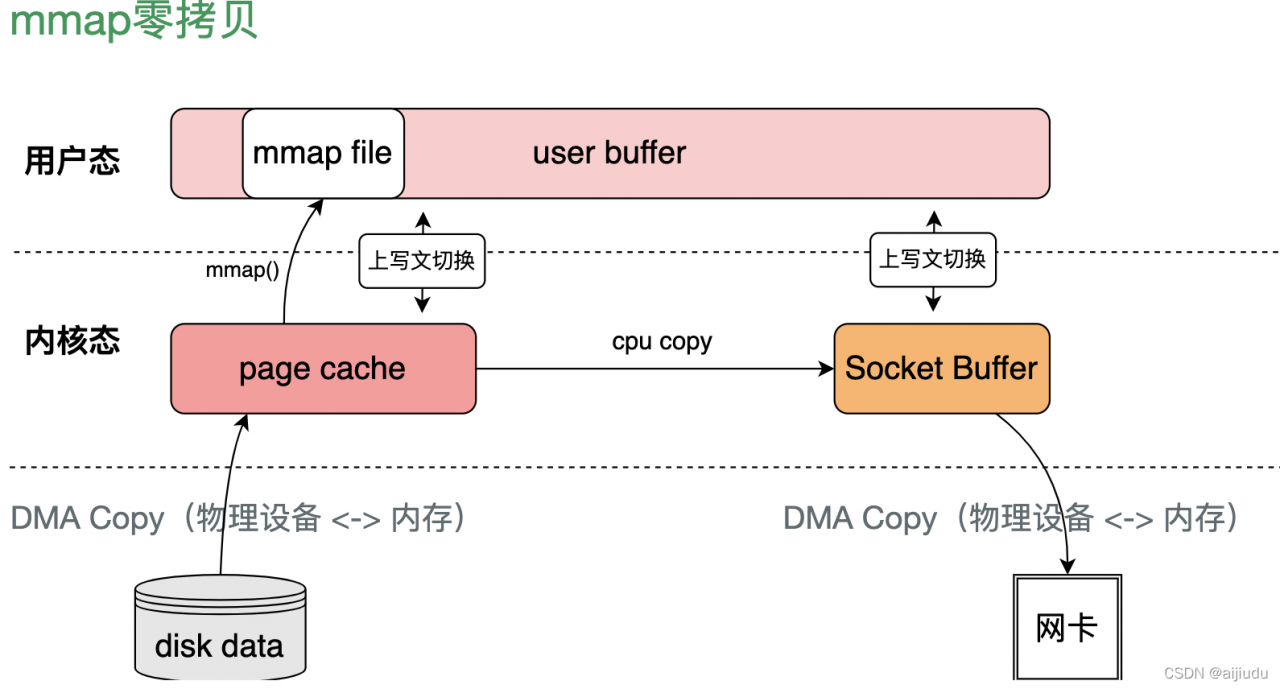mmap:仅代替 read 系统调用,将内核空间地址映射为用户空间地址,write 操作直接作用于内核空间。通过 DMA 技术以及地址映射技术,用户空间与内核空间无须数据拷贝,实现了 zero copy