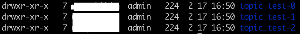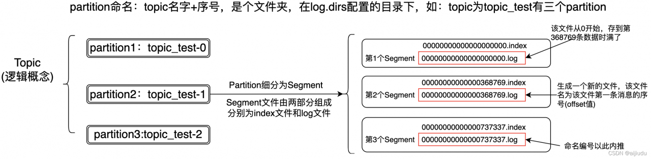 Topic是一个逻辑概念,如下图:partition命名:Topic为topic_test有三个partition,partition的命名是topic名字+序号,是个文件夹,在log.dirs配置的目录下。partition可以细分为Segment,Segment文件由两部分组成