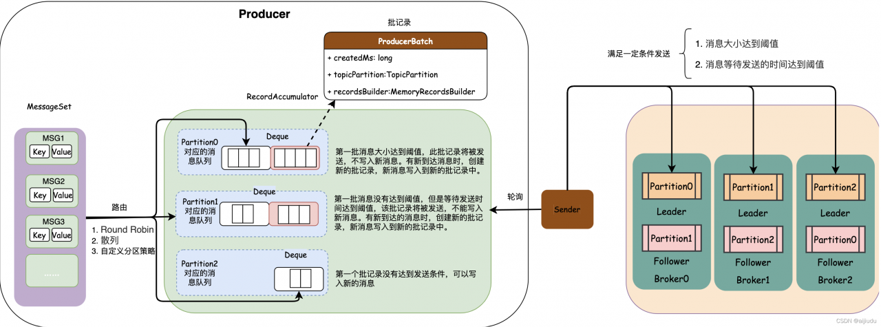 Producer会为每个Partition都创建一个双端队列来缓存客户端消息,队列的每个元素是一个批记录(ProducerBatch),批记录使用createdMs表示批记录的创建时间(批记录中第一条消息加入的时间), topicPartion表示对应的Partition元数据。当Producer生产的消息经过序列化,会被先写入到recordsBuilder对象中。满足发送条件,就会被Sender发送到Partition对应的Leader节点。