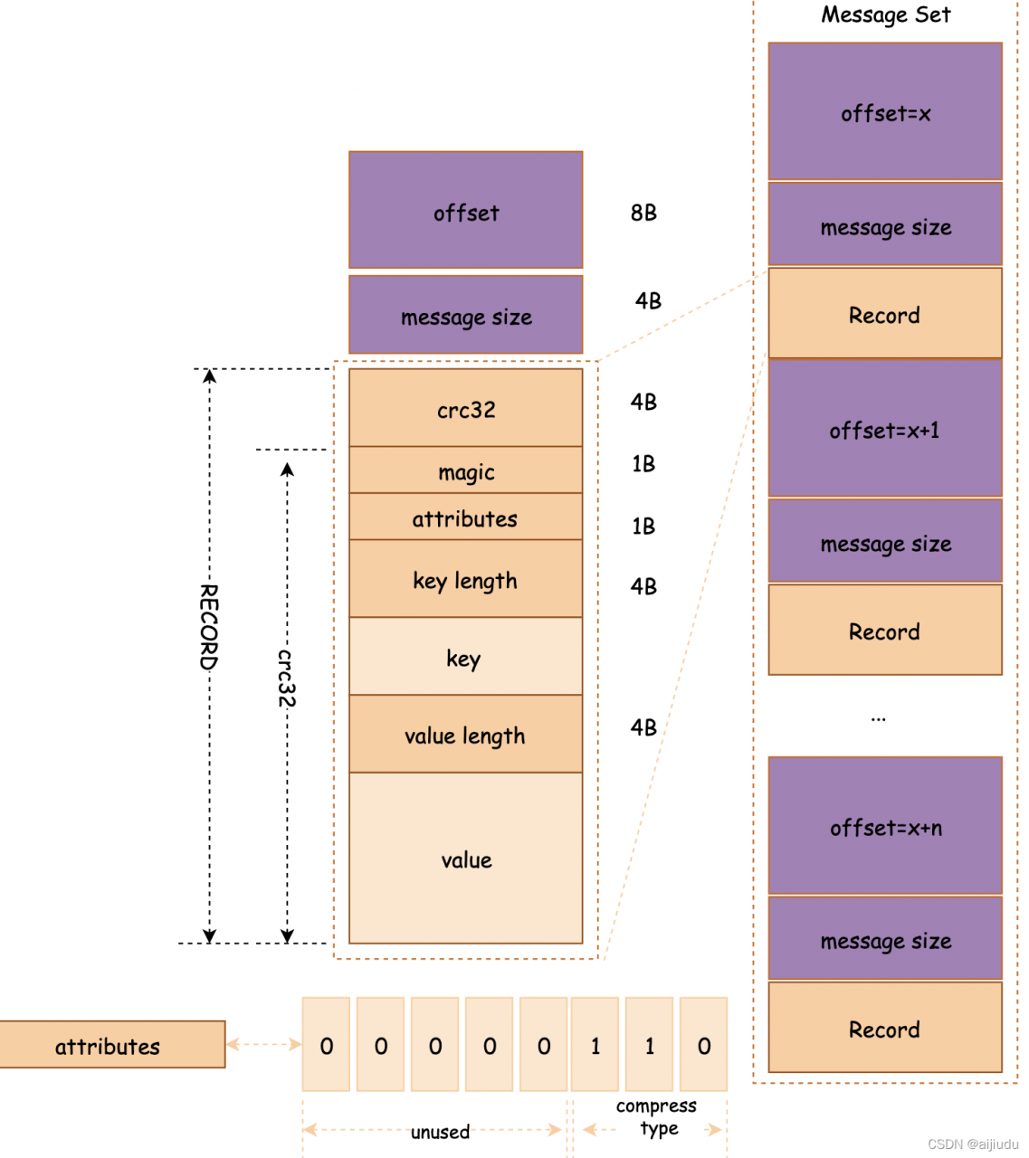 attributes(1B):消息的属性,总共占1个字节,低3位表示压缩类型:0表示NONE、1表示GZIP、2表示SNAPPY、3表示LZ4,其余位保留。