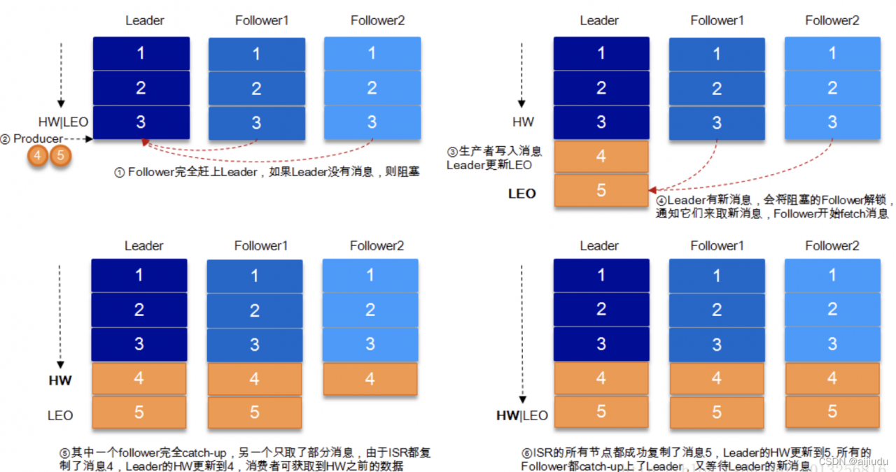 下图详细的说明了当Producer生产消息至Broker后,ISR以及HW和LEO的流转过程: