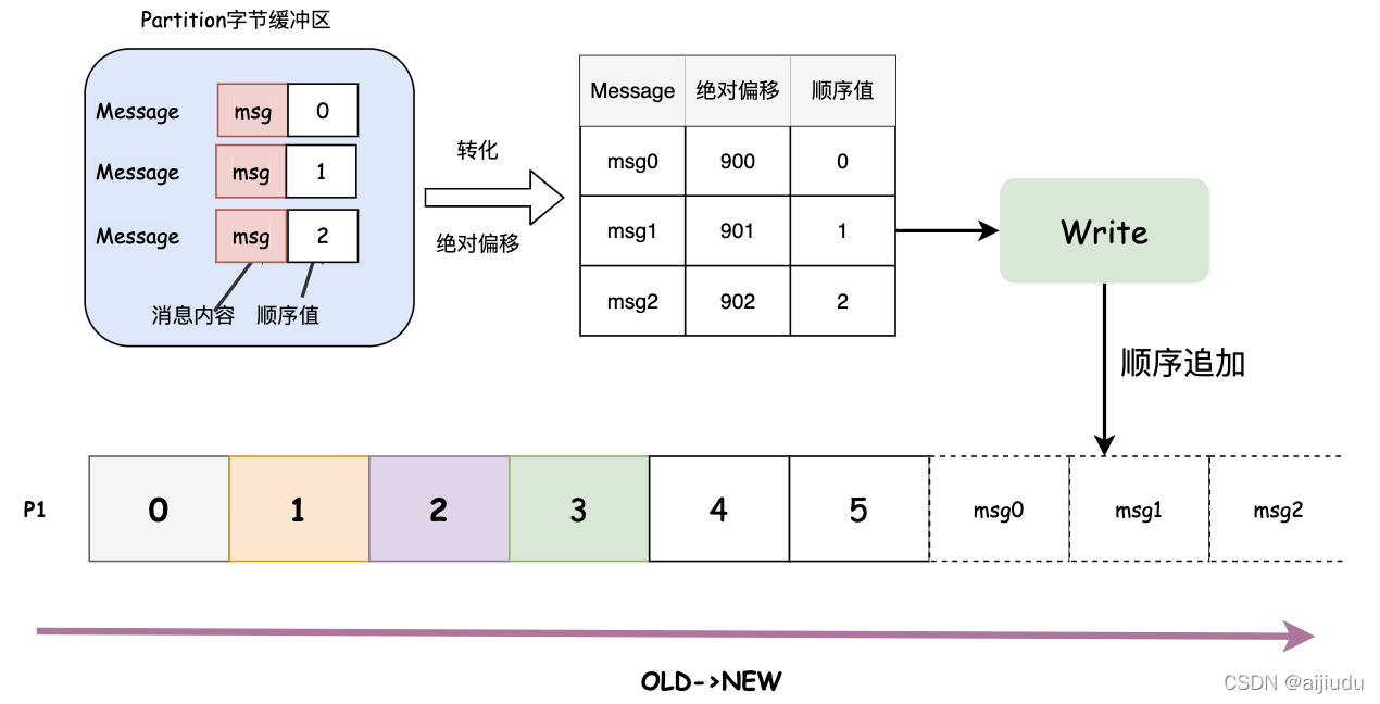 下图给出一个例子,Producer写到Partition1的消息有3条消息,对应的顺序值是[0,1,2]。消息写入前,nextOffset是899,msg0、msg1、msg2是连续写入的三条消息,消息被写入后其绝对偏移量分别是900、901、902,对应的顺序值分别是0、1、2,nextOffset变成902。
