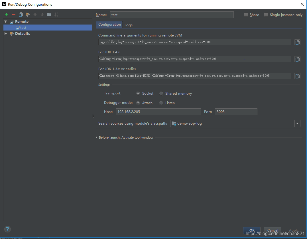 JAVA_OPTS="$JAVA_OPTS -agentlib:jdwp=transport=dt_socket,server=y,suspend=n,address=5005"注意: