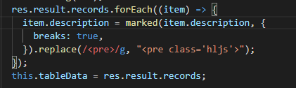 item.description = marked(item.description, {breaks: true}).replace(/<pre>/g, "<pre class='hljs'>");