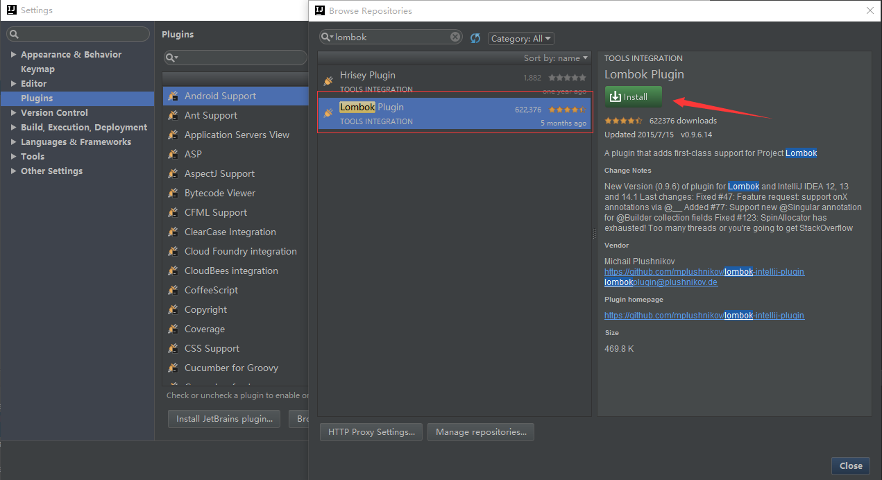 在输入框输入”lombok”,得到搜索结果,选择第二个,点击安装,然后安装提示重启IDEA,安装成功;
