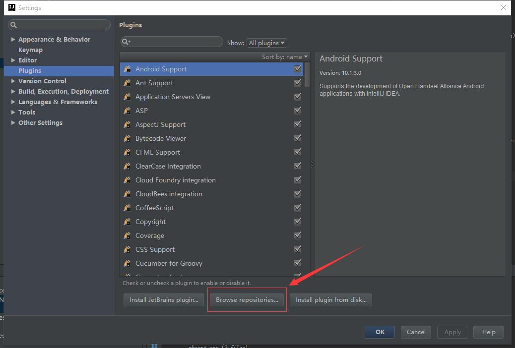 打开IDEA的Settings面板,并选择Plugins选项,然后点击 “Browse repositories..”
