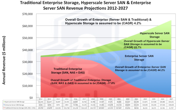 Wikibon坚信Server SAN在未来将逐步取代传统的存储设备,包括SAN、NAS与DAS,但是也将E3S(Enterprise Server SAN Storage)的年复合增长率CAGR(Compound Annual Growth Rate)从2015年预测的44.2%剧烈的下调至22%[22]。显然,这个增长还是一个非常激进的数字,也很显然Wikibon的评估充满变数。