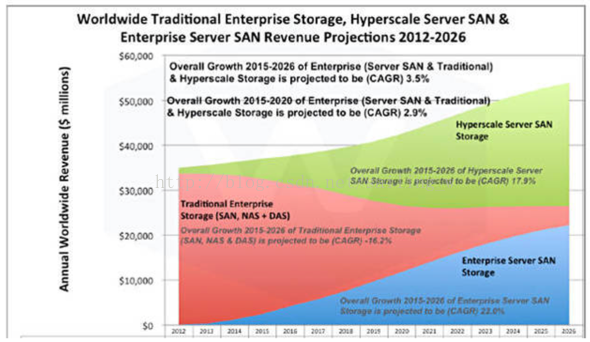 ServerSAN是近期软件定义存储各种概念的合集,具备计算、网络、存储与服务器虚拟化功能,几乎包罗万象。ServerSAN最重要的两个子集是虚拟化计算与分布式存储层。在云计算时代,传统的IOE架构很难适应弹性扩展要求与高并发而举步维艰。这使得世界上几乎每一个角落的移动互联网厂商都在去IOE,并不限于中国政府。Wikibon对ServerSAN的发展寄予厚望,在2016年提出了一个依然激进的路线图。