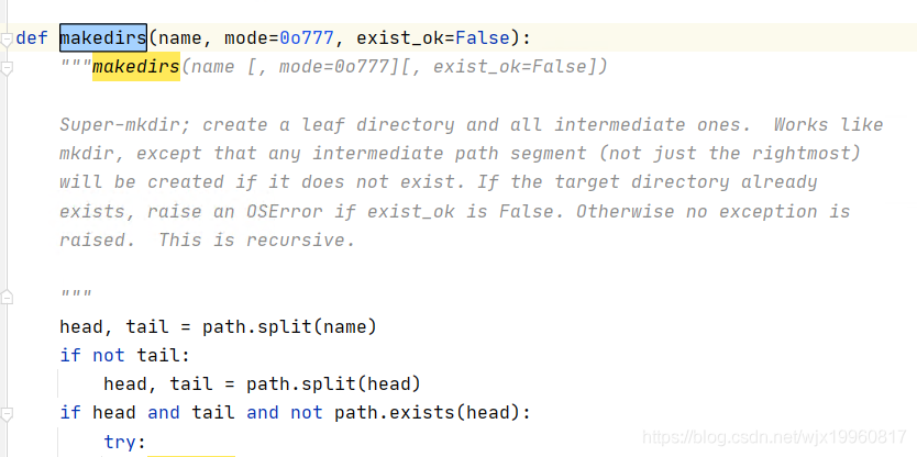 以os.makedirs()函数为例,分别用这两种方法查看模块的位置(PS 如果我们看不到模块所处位置,说明该模块是基于C语言实现,跳转到方法三)