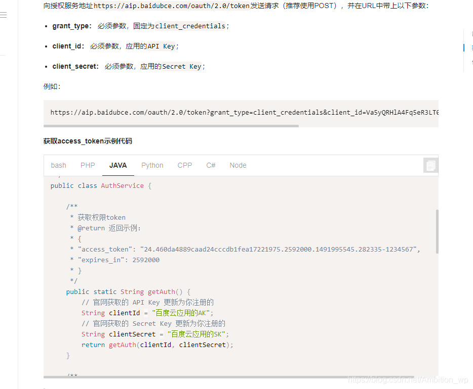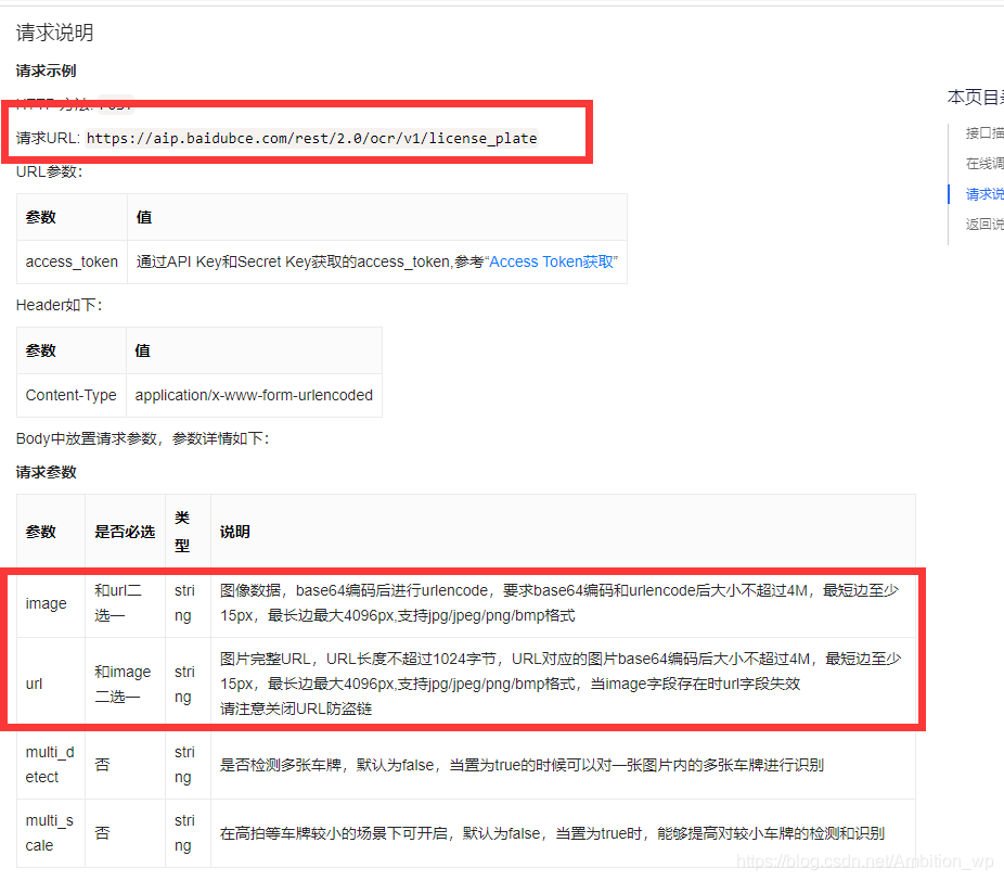 - 下图是接口的描述,包括请求URL、参数,主要的参数是image(图片二进制数据)或url任选其一,还有Aceess Token如何获取。