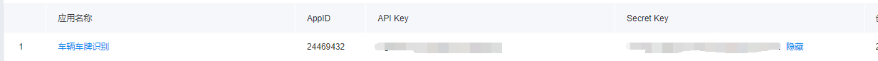 创建成功后界面如下,后续在代码中,调用车牌识别的API需要用到API Key和Secret Key进行身份验证。