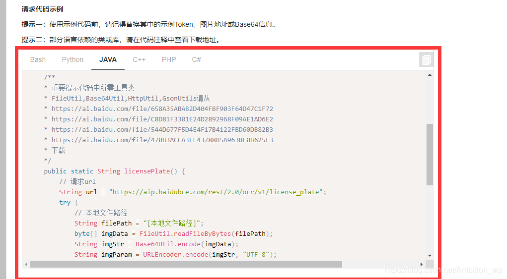 - 下图中,我们选择的是JAVA代码示例,示例中的代码会用到其它的一些工具类,注释中都有相应的下载地址。