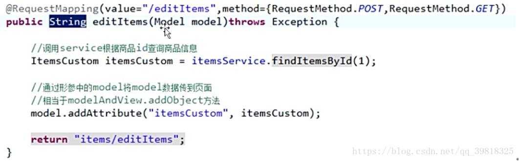 二,若方法返回String类型,则要使用Model,表示返回逻辑视图名,真正视图(jsp路径)=前缀+逻辑视图名+后缀,代码如下: