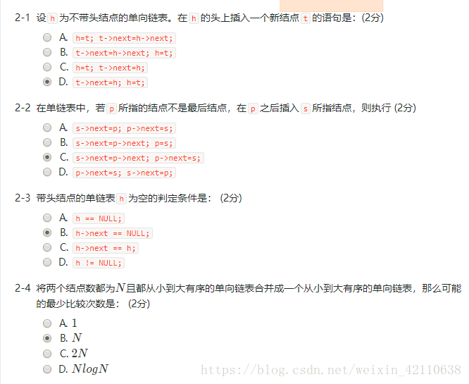 将两个结点数都为N且都从小到大有序的单向链表合并成一个从小到大有序的单向链表,那么可能的最少比较次数是: (2分)