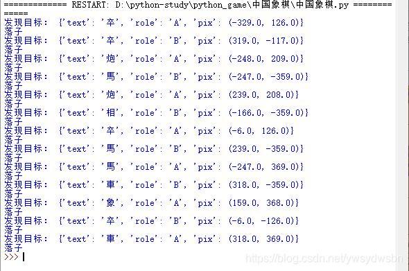 array = [ # A方棋子 { "text": "車", "role": "A", "pix": (-330, 369) }, { "text": "馬", "role": "A", "pix": (-247.0, 369.0) }, { "text": "象", "role": "A", "pix": (-166.0, 369.0) }, { "text": "士", "role": "A", "pix": (-86.0, 368.0) }, { "text": "将", "role": "A", "pix": (-5.0, 369.0) }, { "text": "士", "role": "A", "pix": (79.0, 368.0) }, { "text": "象", "role": "A", "pix": (159.0, 368.0) }, { "text": "馬", "role": "A", "pix": (239.0, 367.0) }, { "text": "車", "role": "A", "pix": (318.0, 369.0) }, { "text": "卒", "role": "A", "pix": (-329.0, 126.0) }, { "text": "卒", "role": "A", "pix": (-167.0, 126.0) }, { "text": "卒", "role": "A", "pix": (-6.0, 126.0) }, { "text": "卒", "role": "A", "pix": (156.0, 126.0) }, { "text": "卒", "role": "A", "pix": (319.0, 126.0) }, { "text": "炮", "role": "A", "pix": (-248.0, 209.0) }, { "text": "炮", "role": "A", "pix": (239.0, 208.0) }, # B方棋子 { "text": "車", "role": "B", "pix": (-330.0, -359.0) }, { "text": "馬", "role": "B", "pix": (-247.0, -359.0) }, { "text": "相", "role": "B", "pix": (-166.0, -359.0) }, { "text": "仕", "role": "B", "pix": (-86.0, -359.0) }, { "text": "帥", "role": "B", "pix": (-5.0, -359.0) }, { "text": "仕", "role": "B", "pix": (79.0, -359.0) }, { "text": "相", "role": "B", "pix": (159.0, -359.0) }, { "text": "馬", "role": "B", "pix": (239.0, -359.0) }, { "text": "車", "role": "B", "pix": (318.0, -359.0) }, { "text": "卒", "role": "B", "pix": (-329.0, -126.0) }, { "text": "卒", "role": "B", "pix": (-167.0, -126.0) }, { "text": "卒", "role": "B", "pix": (-6.0, -126.0) }, { "text": "卒", "role": "B", "pix": (156.0, -117.0) }, { "text": "卒", "role": "B", "pix": (319.0, -117.0) }, { "text": "炮", "role": "B", "pix": (-248.0, -199.0) }, { "text": "炮", "role": "B", "pix": (239.0, -199.0) }, ] 复制代码