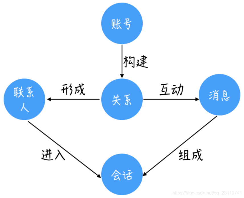 如果我们站在一个使用者的角度从直观体验上来看,一个简单的聊天系统大概由以下元素组成:用户账户,账号关系,联系人列表,消息,聊天会话。
