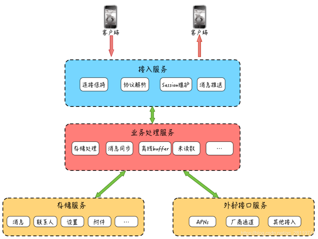 当服务端有消息需要推送给客户端时,也是将经过业务层处理的消息先递交给接入层,再由接入层通过网络发送到客户端。