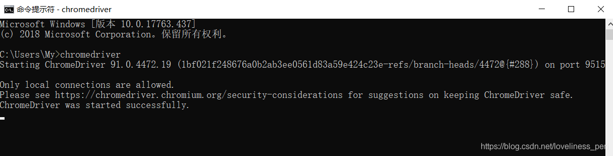 完成后在cmd下输入chromedriver验证是否安装成功: