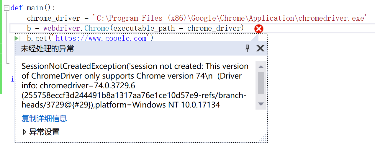 很可能是chromedriver的版本不对(不要问我怎么知道的)。