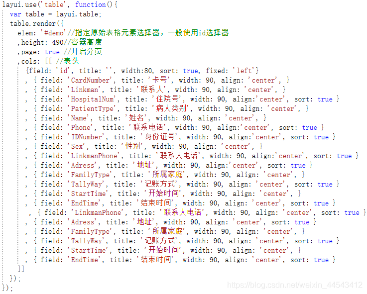 上面代码展示的是table模块的一种见得的使用方式,它还有方法渲染、自动渲染、转静态表格这三种初始化的支持,以便于其满足各种情况的需求。这三种初始化也有各自的使用方法,对表格数据进行渲染。而上面代码所展示的只是clos表头的基本设置,clos表头的一些参数如下: