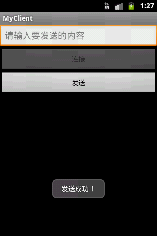 接着,点击客户端的“连接”按钮,看到“连接成功”提示后输入一些内容再点击“发送”按钮,此时客户端显示: