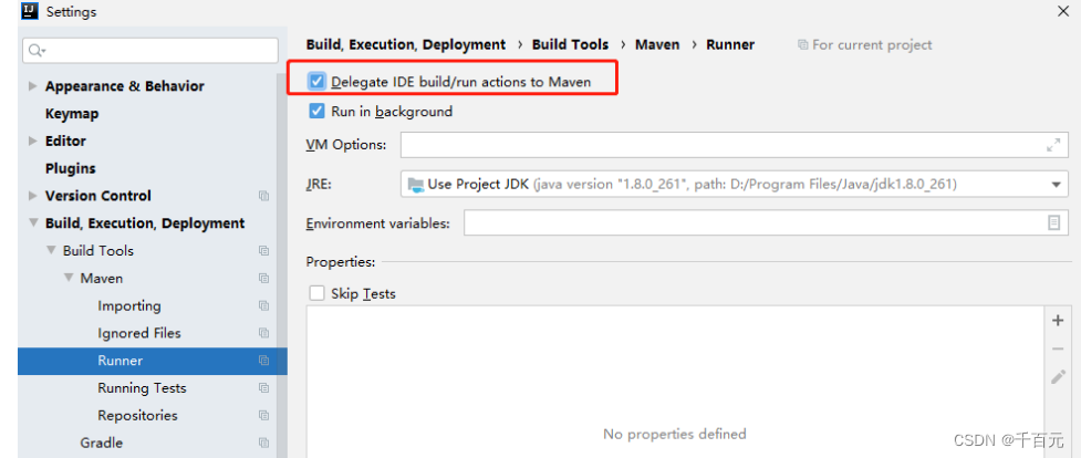 1、修改在File=>settings=>Build,Excution,Deployment=>Maven=>Runner中 在Delegate IDE