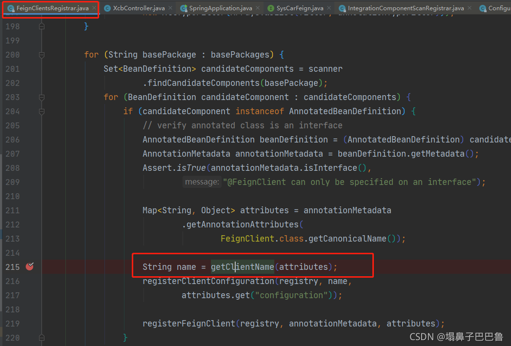 在使用了@FeignClient后,spring会根据该注解去生成bean。查看源码发现此处注册了一个bean,名字就是{name}.FeignClientSpecification。这个name是作为参数传进来的。查看这个方法的调用者: