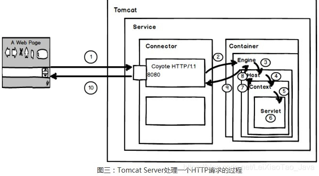 2.Connector把该请求交给它所在的Service的Engine(Container)来处理,并等待Engine的回应;