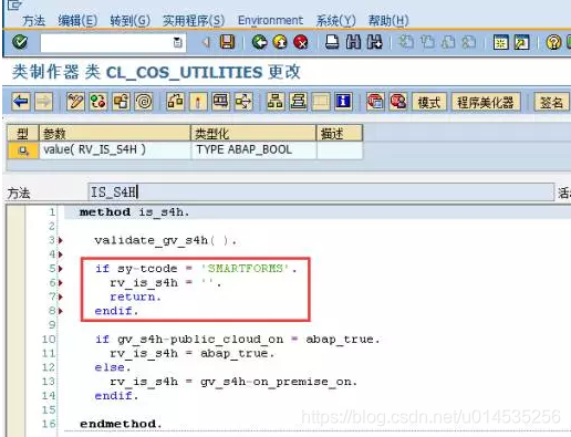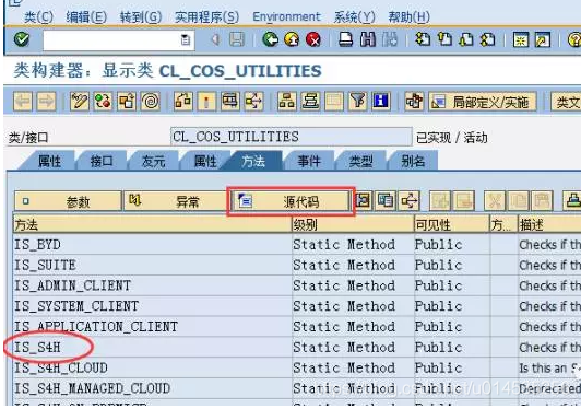 输入:CL_COS_UTILITIES,然后点显示,然后把光标放到IS_S4H上面,点“源代码”,如下图: