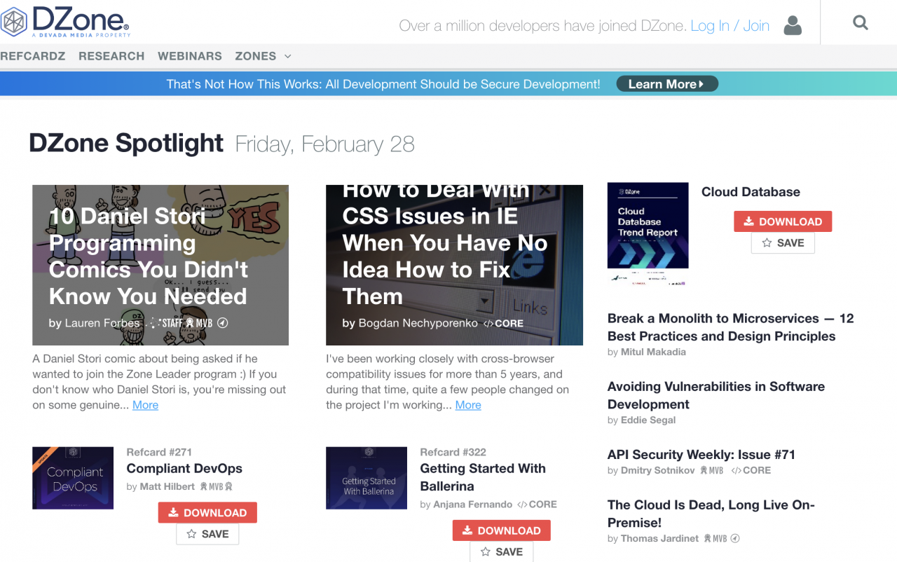 DZone 可以说是我最喜欢的一个技术型的英文网站了,上面的文章观点都很鲜明,所讲到的技术都很新颖,当然了,文章质量也非常高。