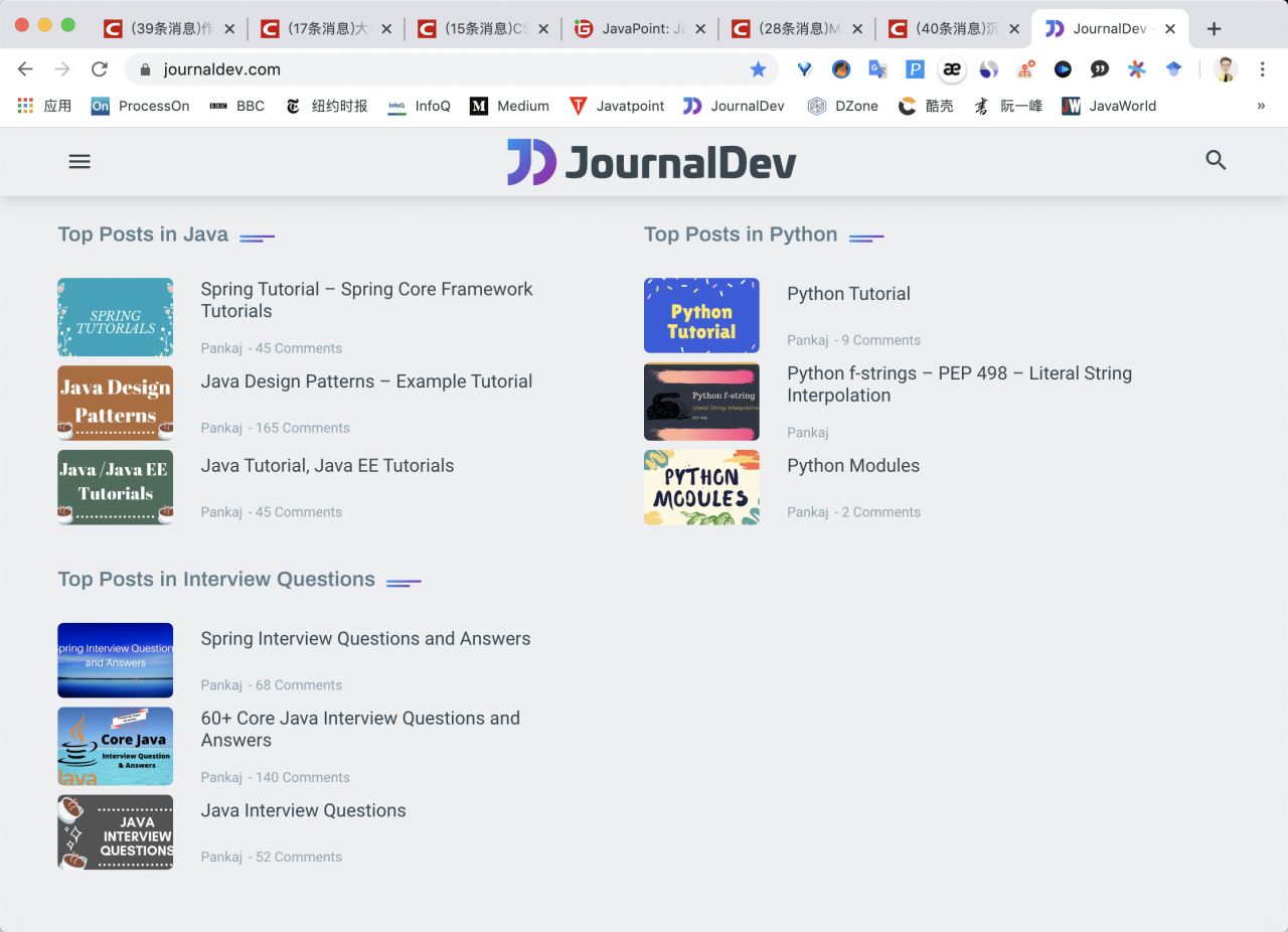 JournalDev 上面的教程堪称经典啊,你看有最热门的两大语言:Java 和 Python,还有各种的面试题解析。