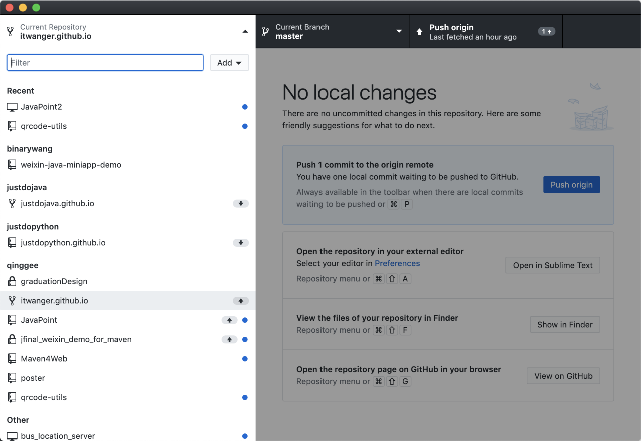 除了开源的项目,一些团队的项目也是可以用 GitHub 桌面版来管理的,可以保证项目代码的及时同步。