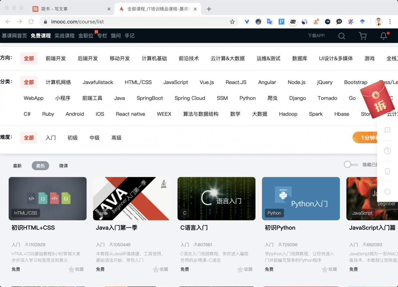 慕课上免费的视频也是不少的,免费不一定不好啊,有些优质的作者由于影响力还没有达到一个级别,但确实水平已经很高,所以录了一些视频放了上去,不管是为了宣传自己的影响力,还是出于其他的目的,对于钱包不是很鼓的你来说,是一个不错的选择。