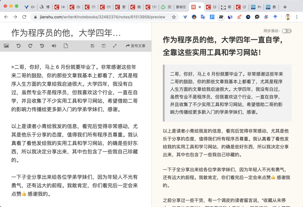 二哥,你好,马上 6 月份就要毕业了。非常感谢这些年来二哥的鼓励,你的那些文章我基本上都看了,尤其是程序人生方面的文章给我启迪很大。大学四年,我没有白过,虽然专业不是程序员,但我喜欢这个行业,一直在自学,并且收集了不少实用工具和学习网站,希望借助二哥的影响力传播给更多新入门的学弟学妹们,感谢。