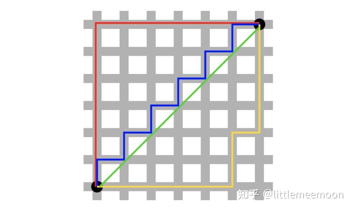 下图中红、蓝与黄线分别表示所有曼哈顿距离都拥有一样长度(12),而绿线表示欧几里得距离有 6 × 2 ≈ 8.48 6 \times \sqrt{2} \approx 8.486×2≈8.48 的长度: