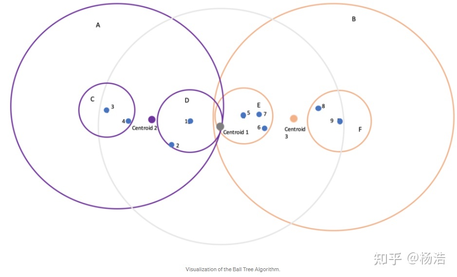 Ball Tree Algorithm (球树算法),用超平面Circle(2D)或Sphere(3D)将所有的数据点分解到两个簇(cluster),这个平面经常被称为超平面(hypersphere),而每个簇表示树的两个节点。.