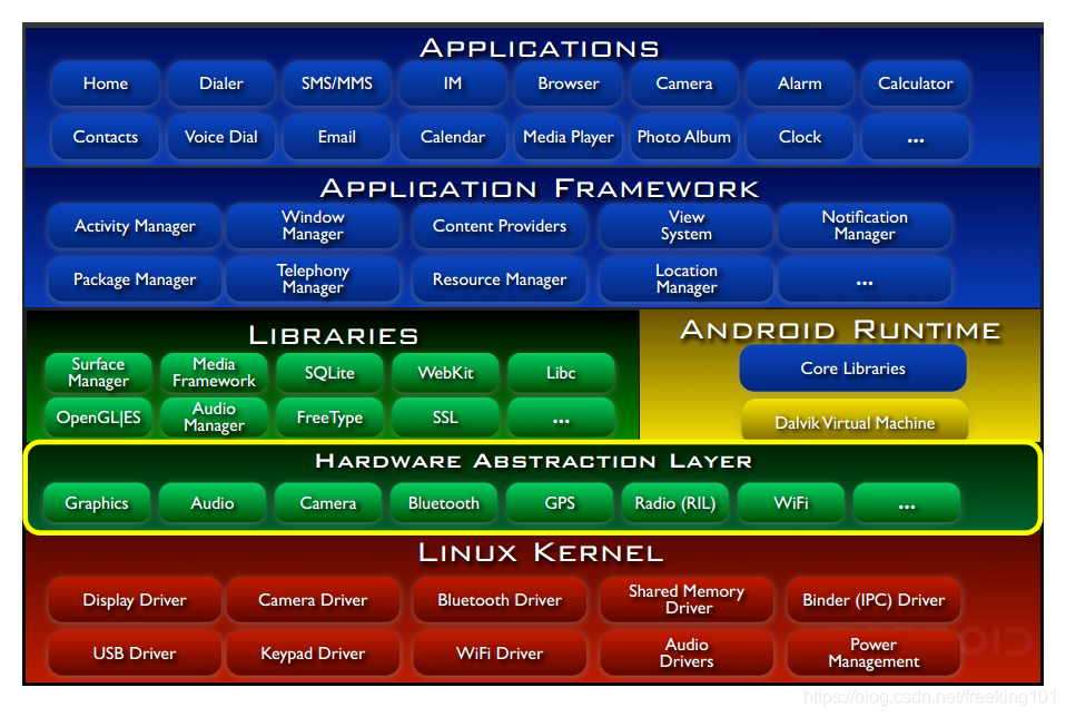 硬件抽象层 (HAL) 提供标准接口,向更高级别的 Java API 框架显示设备硬件功能。HAL 包含多个库模块,其中每个模块都为特定类型的硬件组件实现一组接口,比如WIFI/蓝牙模块,当框架API请求访问设备硬件时,Android系统将为该硬件加载相应的库模块。