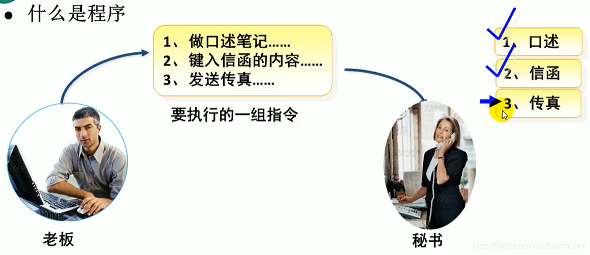 在上图中,上部分类比为程序,老板和秘书通过对话的形式进行交互。下部分是计算机实现老板布置的指令过程,计算机通过程序实现交互,程序员将main.go源码进行编译,得到一个可执行文件(二进制)main.exe,电脑再去执行操作。